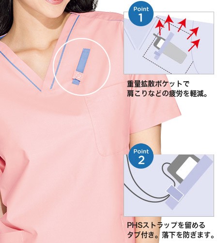 一点にかかっていた重みをポケット全体に分散することで 肩こりなどの疲労を軽減します。また、ポケット口にPHSのストラップを留めるタグを装備。 落下を防ぎ、業務時の安心感を高めます。