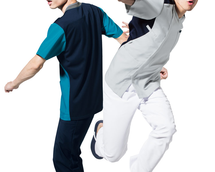 動きやすくて涼しい、ニット素材を用いた異素材コラボのスクラブを進化したスポーツテイストが登場! 背面から脇にニットを使用し、ストレッチ性と吸汗速乾に優れた素材。また、襟にはリブ生地にすることで、着心地と汗を素早く吸収。通気性もよく、涼しく過ごせて汗が目立ちません。