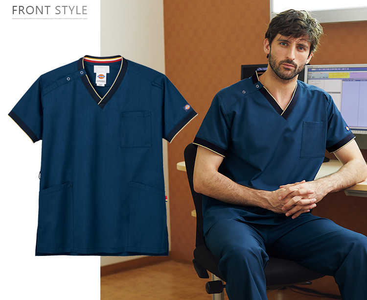 襟と袖をネイビーにイエローのアクセントを効かせたオシャレなリブ仕様にすることで、ディッキーズらしいカジュアルでスポーティーなデザインが魅力の男女兼用スクラブです。