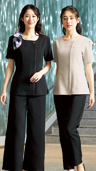 モダンでエレガントなおもてなし向けチュニック。前衿ぐりをスクエア、後ろをV開きにしたことで女性ならではの上品な印象に。羽織って着られるジップタイプなので、着脱が楽チン。