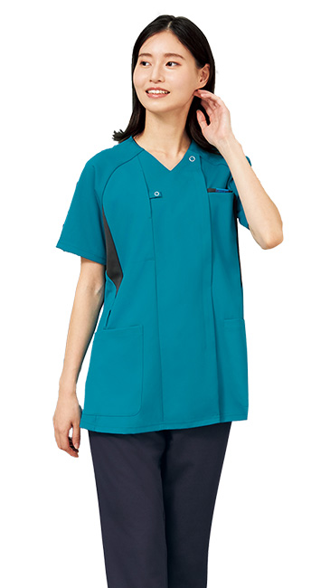 胸の蛍光フラップは、出す・入れるの着方で日勤夜勤の勤務を識別できるレディースジップスクラブ。背面と袖にはニットを施し柔らかくリラックスした着心地が魅力のスクラブです。