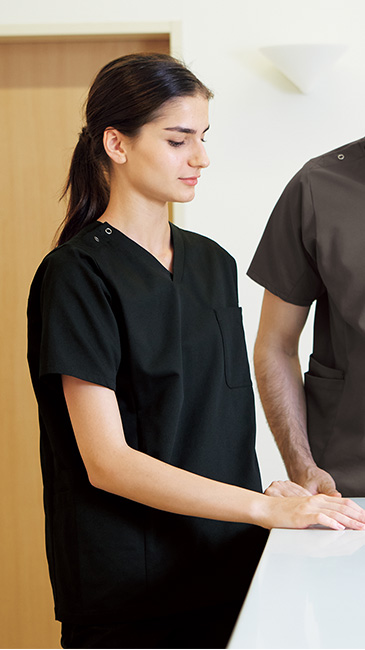 アメリカ発のスクラブを小柄な日本人体型にフィットするようにリニューアル。 ジャストフィットサイズのスクラブが軽快な現場ワークをサポートします。