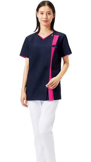 ジップスクラブ®シリーズの中でも人気のシリーズに、カチオン染料を使用した色落ちに強いスクラブが新登場!印象的な縦の切り替えはスポーティーでアクティブな印象を与えます。おしゃれでカッコイイスクラブは、前ファスナーなので脱着も楽で、髪型やメイクの崩れも防げます。お尻後ろまで隠れる少し長めの丈も嬉しい女性用スクラブ。