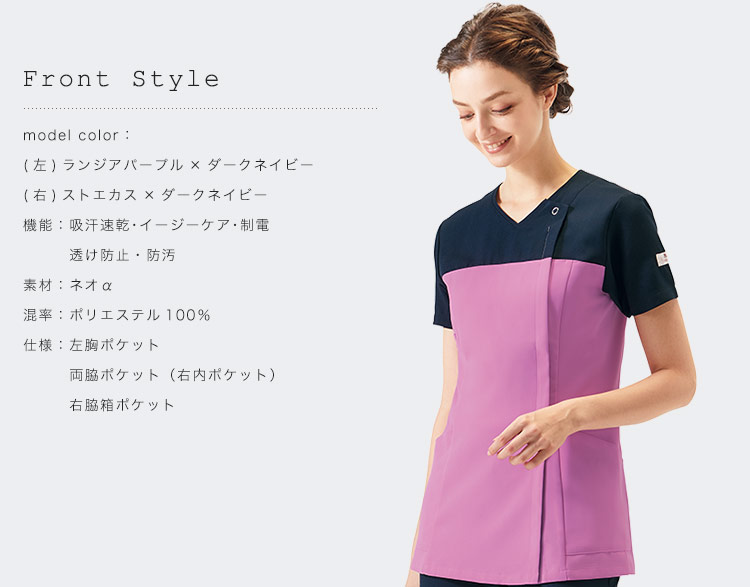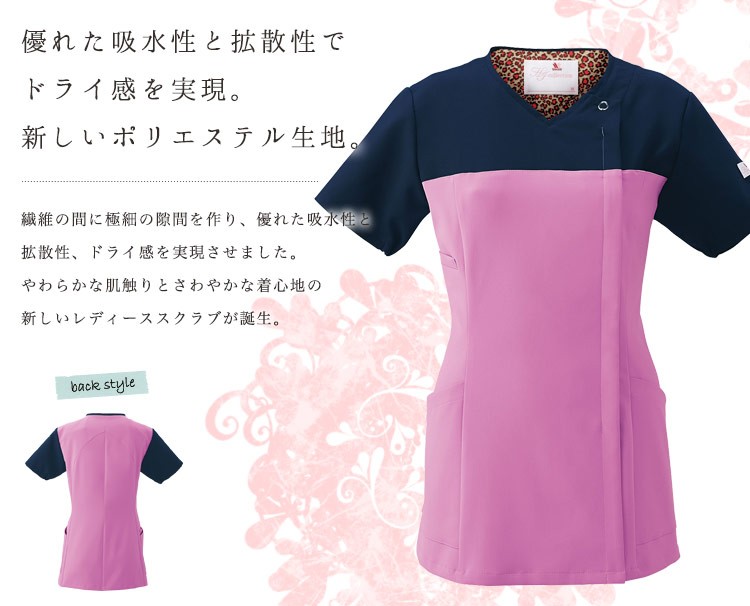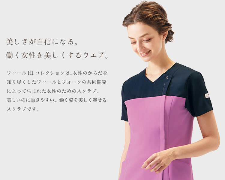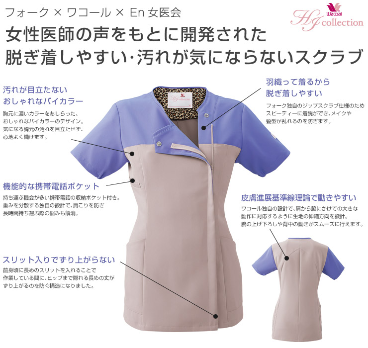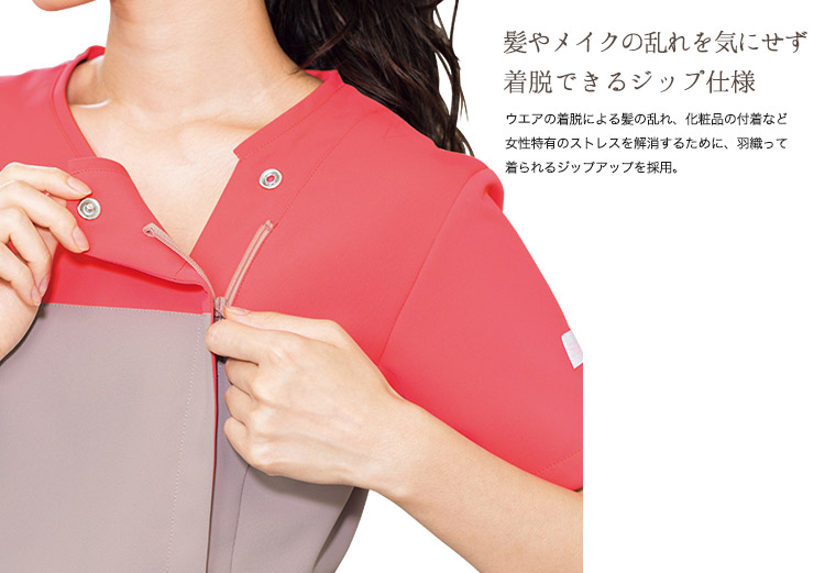 羽織って着られる、ジップタイプのレディーススクラブ。 髪やメイクの乱れを気にせず着用できます。 働く女性を美しく、動きやすくするワコールHIコレクションシリーズ。 また汚れを目立たせないシックなバイカラーで、おしゃれと機能性を両立しています。