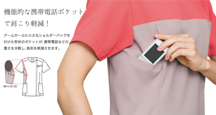 - 左胸ポケット、右脇箱ポケット、袖下ゴム入り、両脇ポケット(右内ポケット付)