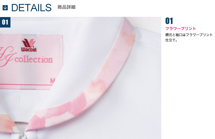 襟元と袖口のフラワープリントが、ほどよい甘さと優しさを演出。