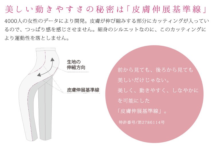 皮膚伸展基準線により、ヒップ周りのつっぱり感を抑え、見た目のスリムさも実現しました。ひざの屈伸もラクラク