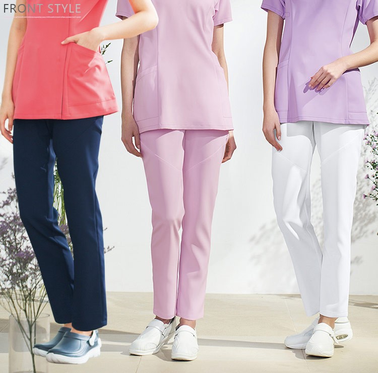 ワコールHIコレクションシリーズのスクラブとコーディネートできるようにリリスピンクの鮮やかなカラーをご用意。ホワイトやダークネイビーのスタンダードな色も取り揃えたスリムストレートパンツ。