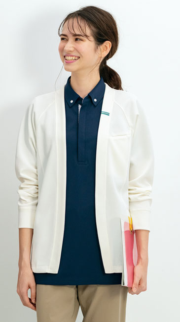 前にかかんでも裾が垂れない設計で、介護の現場で大変使いやすいカーディガン。男女兼用なので、職員全員で揃えられます。スッキリしたシルエットで、施設利用者さまの印象も良くなります。