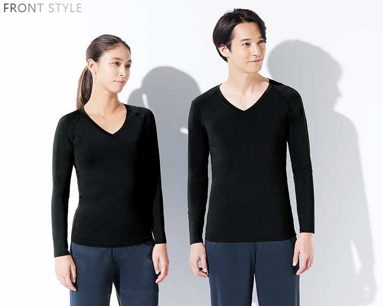 特殊セラミックの粉末が練りこまれた機能素材を使用。体から放射される遠赤外線を吸収し輻射することで保温効果を与えます。血行を促進し、疲労軽減をサポートします。軽くて薄く、ストレッチ性が高いので、突っ張らず、腕の上げ下げがしやすく、動きやすさも抜群です。