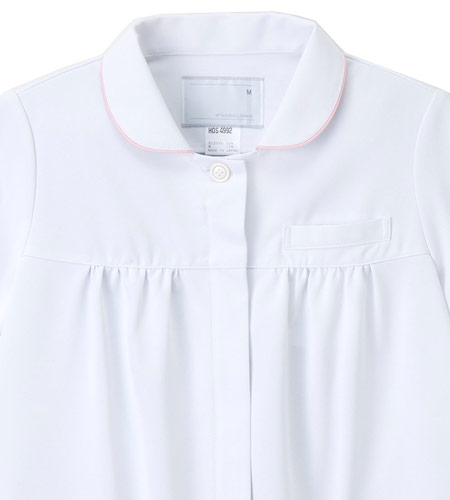 胸元のギャザーが女性らしくやさしい雰囲気をもたらします。左胸ポケット付き。両腰ポケット