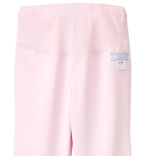 活動を束縛しないように作られたマタニティパンツ。ウエスト上端にはサイズの調節ができるゴムがついています。おなかの部分にはリブ生地を使用しているため、体型の変化にも対応します。