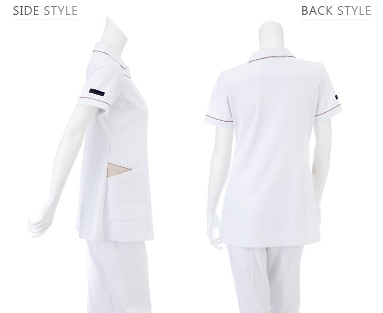 キチンとした印象の襟付きタイプです。デザインポイントのボタン部分が全体を引き締めています。色の組み合わせが落ち着いた上品な雰囲気で木目調の院内に合う白がスッキリしたスクラブ。接触冷感素材でひんやり快適な着心地。