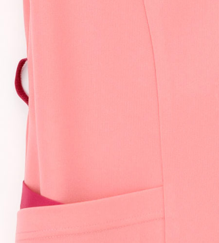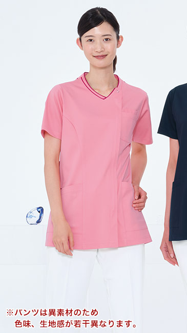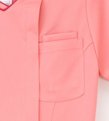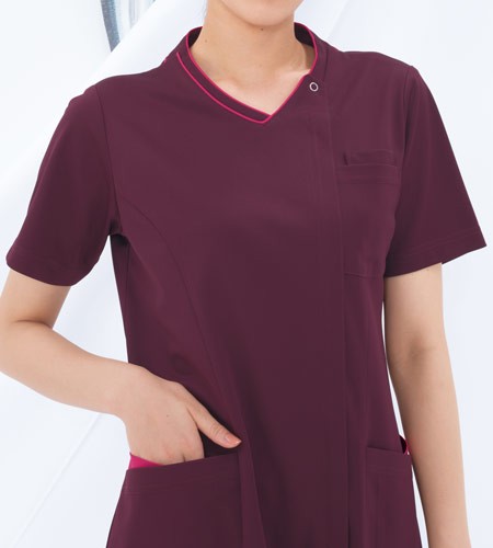 フロントファスナー開きで着脱楽々。 着替える際の化粧や髪型が崩れるわずらわしさを解消しました。 接触冷感のニットで熱がこもりにくく、快適な着心地です。 さりげないアシンメトリーの襟元が美しいレディーススクラブ。動きやすさと女性らしいラインで院内が明るくなります。