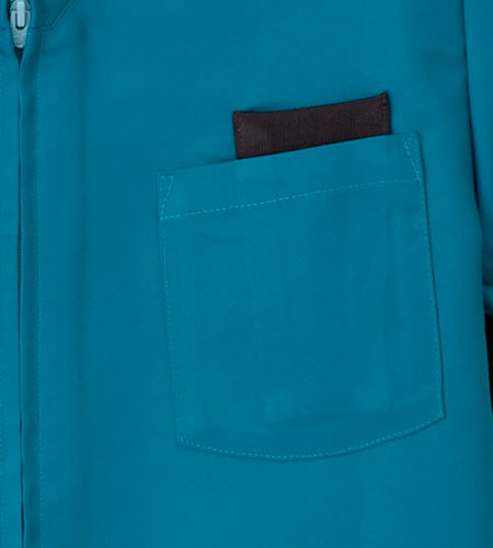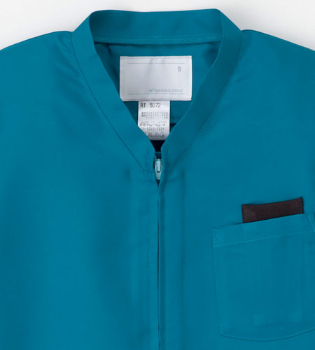 フロントファスナー開きタイプでスピーディーな着脱を可能にしました。左胸2重ポケット(PHSポケット付き)
