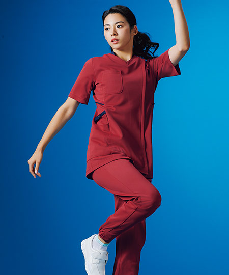 動体裁断の4D構造なので、どこまでもスムーズで美しいシルエット。ファスナータイプでアクティブスタイルのスクラブです。高い機能性を確保しつつ、これまでにない動きやすさを実現しています。