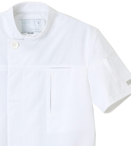 - 制菌、透け防止、制電、吸水、防汚、左胸ポケット、左腕ペンポケット、両腰ポケット