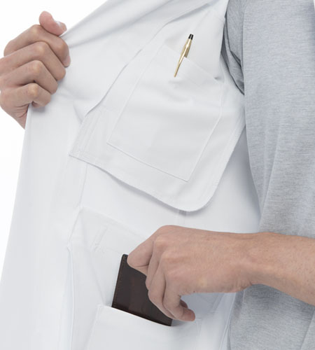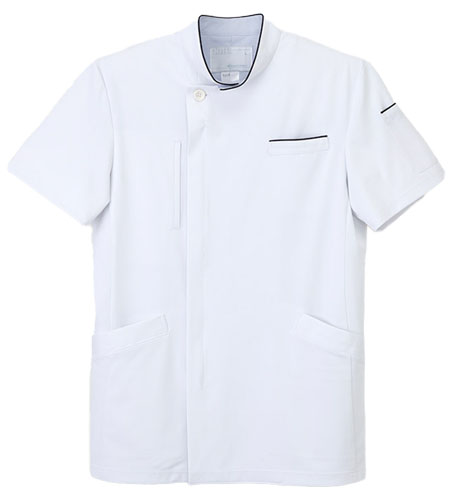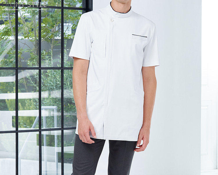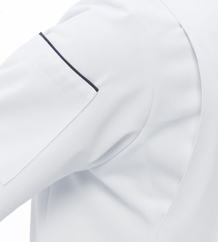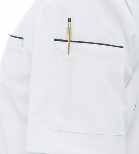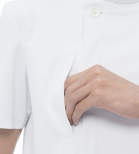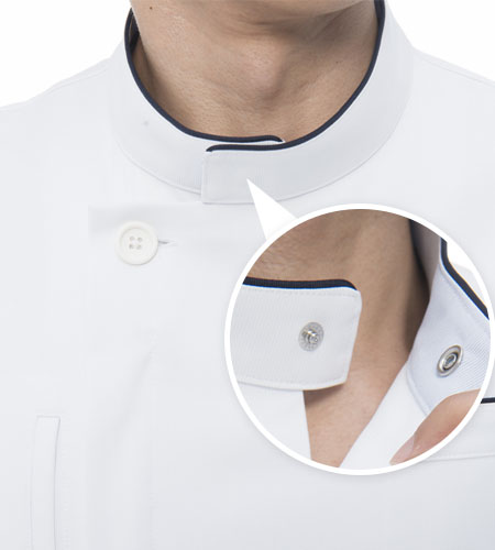 スタンドカラーなので飛沫等の侵入を軽減します。ボタン付きでしっかりとめることができます。右胸ポケット