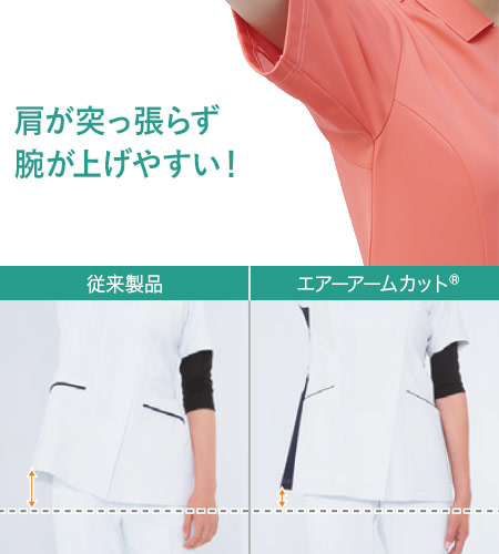 肩のつっぱりが少ないエアーアームカット。身体に沿うようなっており、裾もめくれ上がりにくくなっています。