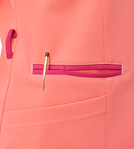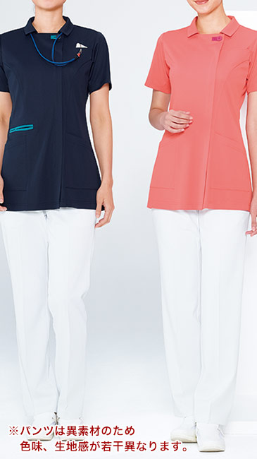 風合いよくやわらかなニットのストレッチ素材のチュニックは、特殊な糸使いにより肌に触れるとヒヤっとする接触冷感素材の高性能なメディカルウェア。女性らしいキレイ色に着る人を選ばないデザインで、業務用洗濯にも耐えうる形態安定素材なのも嬉しい。