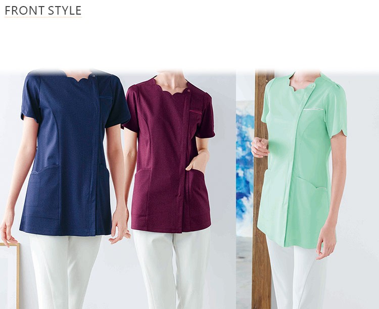 ナガイレーベンの「ナースの毎日をより輝かせる」Bright Daysシリーズ。スカラップ状のネックラインが女性らしいやさしさと優美さを感じさせるチュニック。顔色を美しく見せるレフ版効果のカラーを採用。