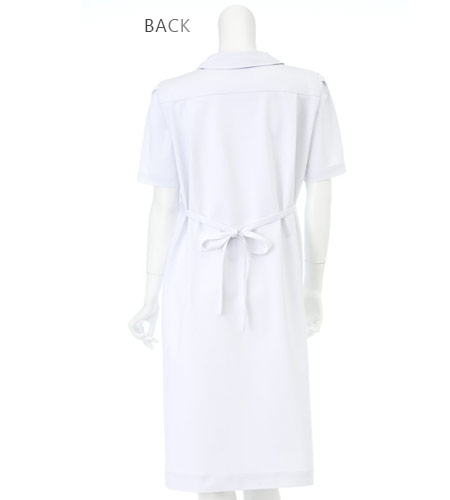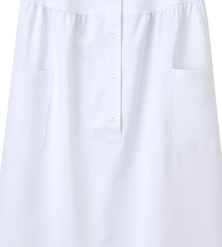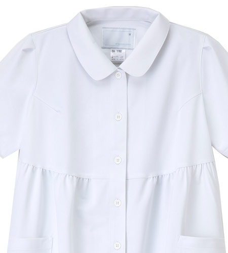 ゆったりした肩回りと丸襟がかわいい前釦開き仕様。両腰ポケット
