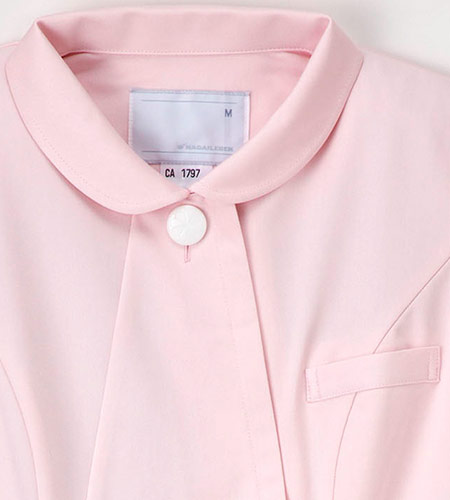 小さな丸襟と大きな丸ボタンで首回りが華やか。 襟元から裾にかけて広がるラインが新鮮なデザイン。 左胸には便利なポケット付き。両腰ポケット
