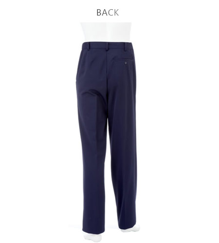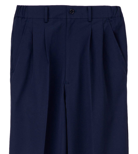 信頼性と清潔感をアップさせるネイビーのパンツはウエストツータック、両脇ゴム入りのややゆったりシルエットパンツです。高い伸縮性を持ち、着心地の良さと動きやすさを提供します。