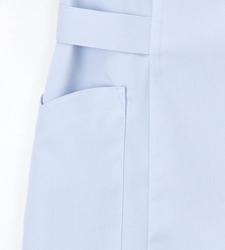 ロールカラーの優しい襟元が柔らかな風合いの素材とマッチして患者さんの心を和らげます。 患者さんを考慮して、できるだけ胸に物を入れないように、左だけがポケットになっています。 胸元のグログランテープが、ロマンティックで女性らしいアクセントに。
