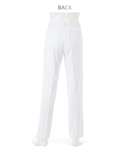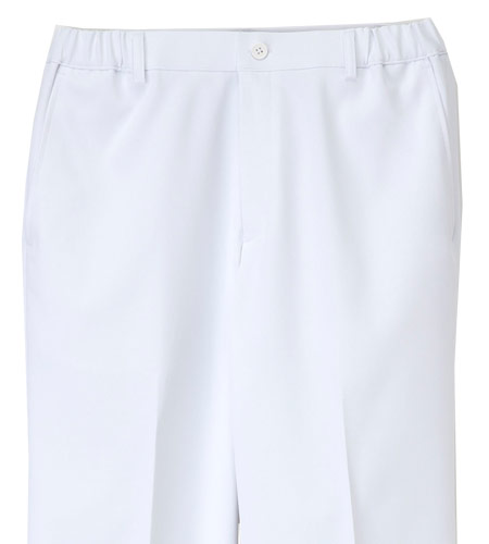 ナガイレーベンのシルエットがすっきりしたノータックパンツです。ストレッチ性が豊かな素材を使用しているため快適な履き心地です。脇ゴム仕様なので楽に着用できます。