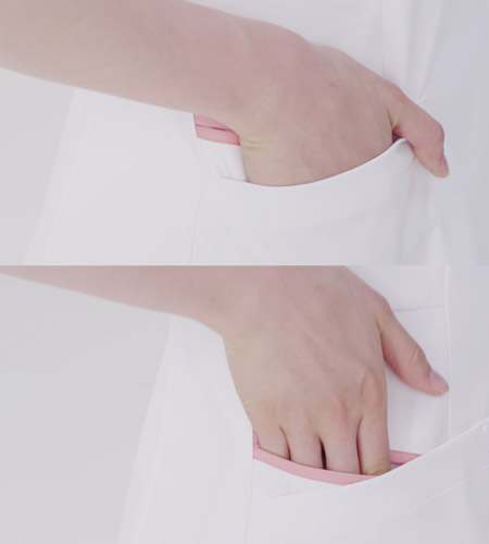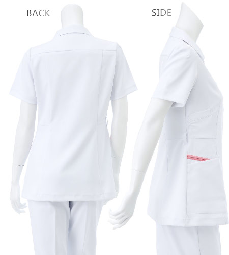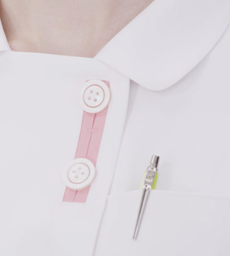 ボタンホールのアクセントカラーがかわいくて人気。ビタミンカラーで周りの雰囲気を明るくします。 また左胸ポケットにはPHSポケット付き。ダブルポケット