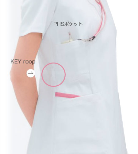 右脇にもPHSポケット付き。首から下げてたPHSを入れておくことができて、首にかかる負担を軽減。 ループには鍵などを引っ掛けておくことができて便利です。