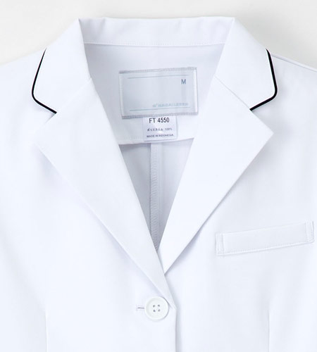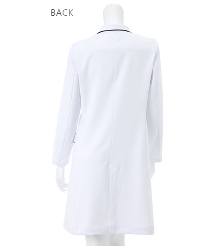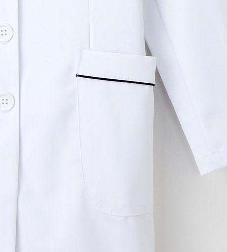 襟元にネイビーの細いライン入りで、顔周りをきりっと引き締め、ドクターとしての信頼感を高めます。 左胸には便利なポケット付きです。両腰ポケット