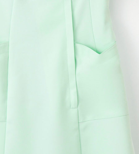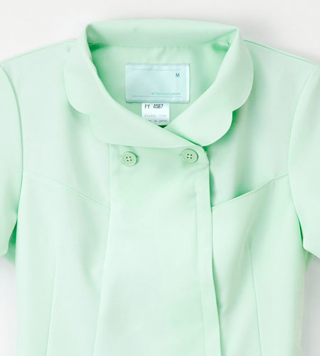 花びらを思わせるソフトな襟に、思わず看護の張りつめた空気が和らぎます。 シルエットの美しい素材がよりやさしさを強調。 ポケットのやさしいカーブは物が落ちにくい構造にもなっています。