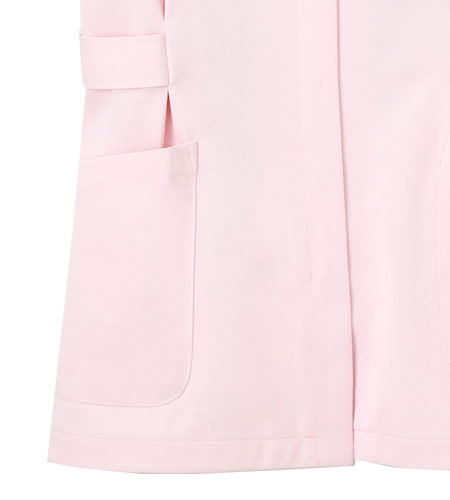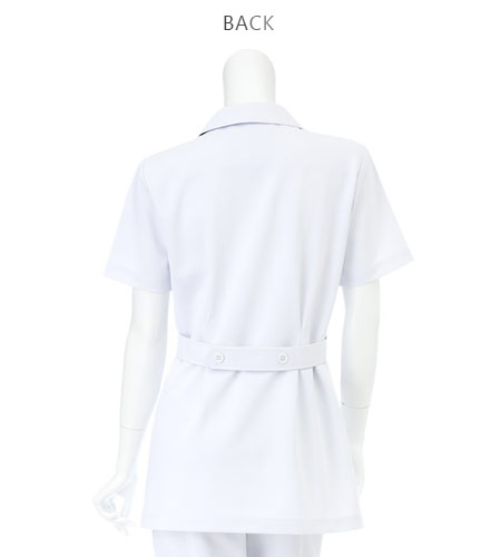 丸襟が女性らしさを感じさせるシンプルな白衣。ウエストのタックとベルトでキリっと爽やかに着る事ができます。左胸、両腰ポケット付き。