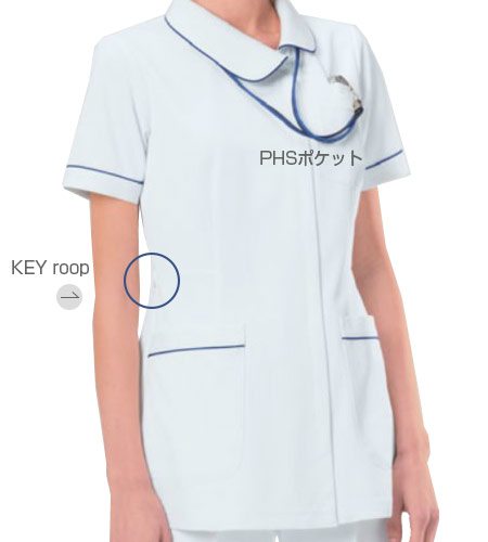 カラフルなコードが院内を明るい雰囲気にします。豊かな伸縮性と通気性を備えたニット素材を使用していて着心地も良く動きやすくて快適です。左胸には便利なPHSポケット付きです。