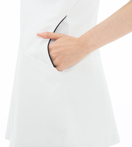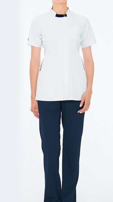 肩のつっぱりが少ないエアーアームカット®。腕の可動性が高く、裾が上がりにくいデザイン設計。左胸2重ポケット(PHSポケット付き)