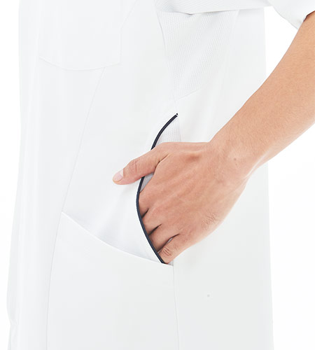 肩のつっぱりが少ないエアーアームカット®。腕の可動性が高く、裾が上がりにくいデザイン設計。左胸2重ポケット(PHSポケット付き)
