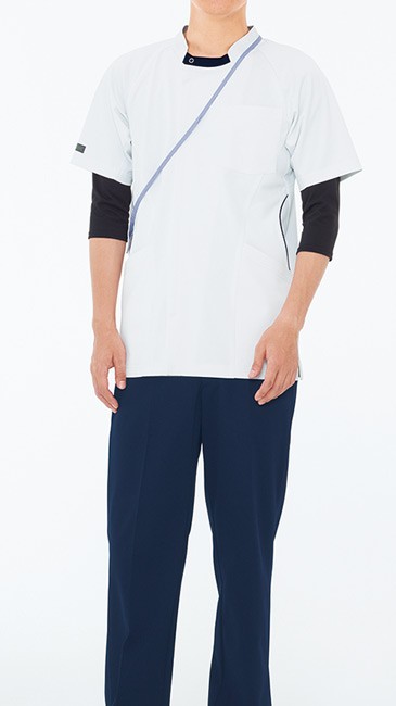 肩のつっぱりが少ないエアーアームカット®。腕の可動性が高く、裾が上がりにくいデザイン設計。左胸2重ポケット(PHSポケット付き)