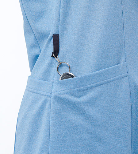 両腰には便利なポケット付き。仕事に欠かせない小物を整理して収納できます。袖口のトリミング