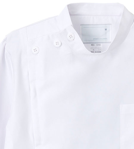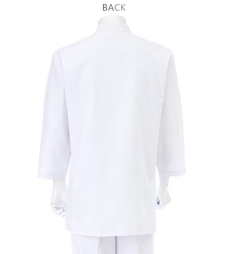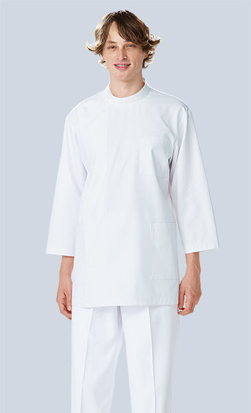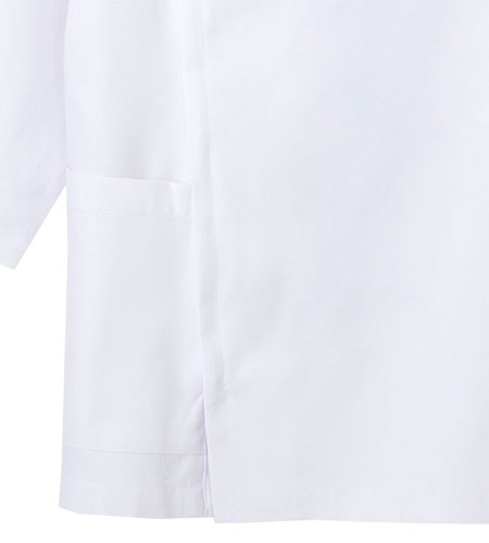 首元は白衣と同色の3つボタンがポイント。左胸ポケット付き。両腰ポケット