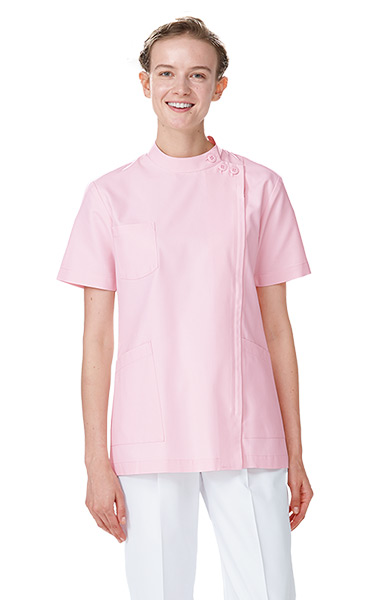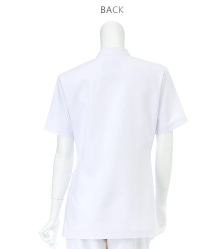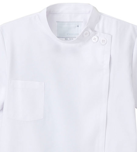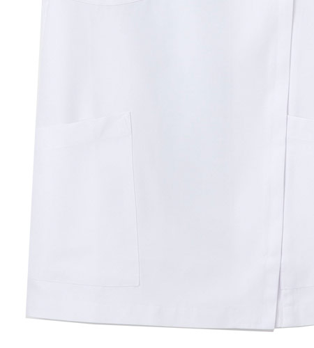 首元は白衣と同色の3つ釦がポイント。右胸ポケット付き。両腰ポケット