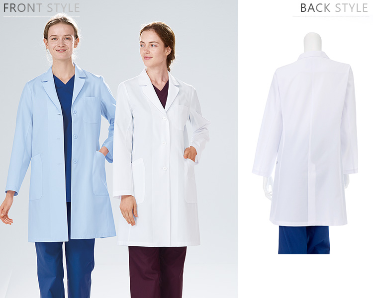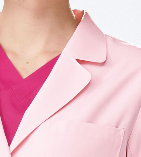 形態安定性に優れたKEX素材。軽やかなショート丈のレディス診察衣。丸みのある襟が優しい印象を与えるレディース白衣。