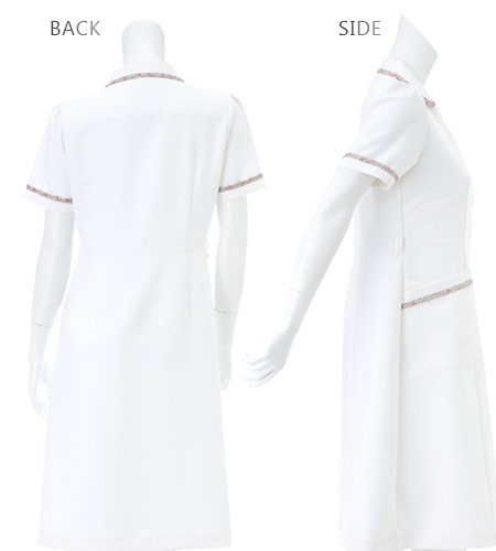 女性らしい優しい色合いのリバティ花柄プリント素材を使った、リバティプリントワンピース。 優しいリバティで衿周り、袖口とポケット口をトリミングしました。衿元はゆったり涼しげです。「LOVE DAY」というリバティ社オリジナルのプリント柄がナガイレーベンオリジナルにアレンジされています。 リバティプリントらしい繊細な花柄は、院内や患者様を明るく優しい気持ちにしてくれます。