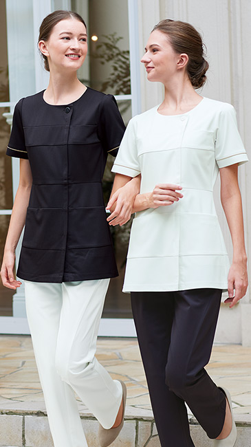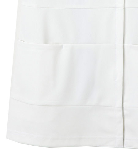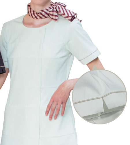 おもてなしスタイルをアップするBeads Berryシリーズから、接触冷感でひんやり涼しいチュニック白衣が登場。 肌側には冷感が優れた高吸湿性能のキュプラを挿入する事で、肌触りが爽やかで涼しさを感じる事ができます。高級感とモード感のあるカッティングと女性らしいやさしさが感じられるノーカラーのデザインはおもてなしの心を表現しています。左胸・両腰ポケットなど機能面も充実しています。