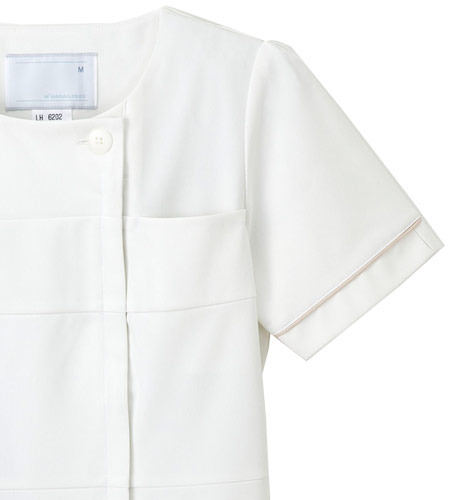 袖部分にはパイピングとカッティングを施し、デザイン性をアップ。 高級感とモード感のある女性らしいやさしさが感じられるノーカラーのデザインはおもてなしの心を表現しています。左胸ポケット