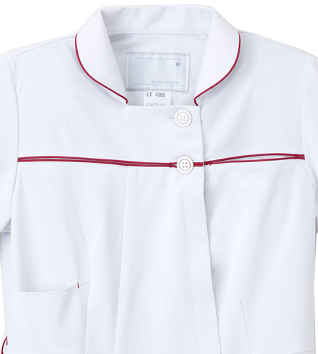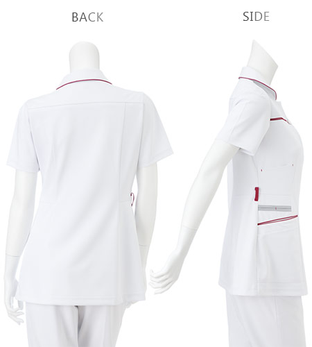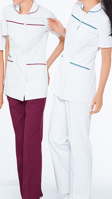 スナップボタンの開閉とフロントファスナー開きタイプでスピーディーな着脱を可能にしました。2本の明るいカラーのコードが院内にエネルギーを与えてくれます。両腰ポケット