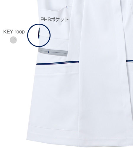右胸下にはPHSポケット付き。首から下げたPHSを入れておくことができて、首にかかる負担を軽減。ループには鍵などを引っ掛けておくことができて便利です。カラーバリエーションColor variation