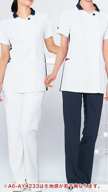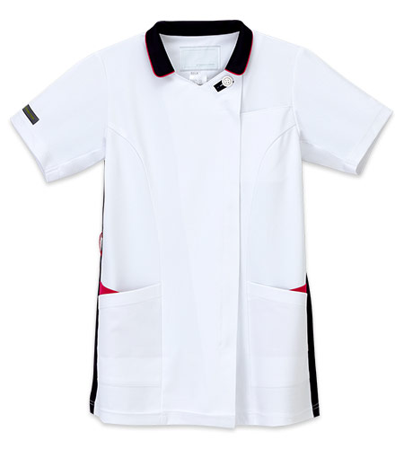 玉縁テクニックがデザイン性と高級感を印象づけるチュニック白衣。腕の可動範囲を広げる脇のカットや接触冷感素材で快適なお仕事をサポート。業務用洗濯にも耐えうる形態安定素材で衣服が長持ちするのも嬉しい!