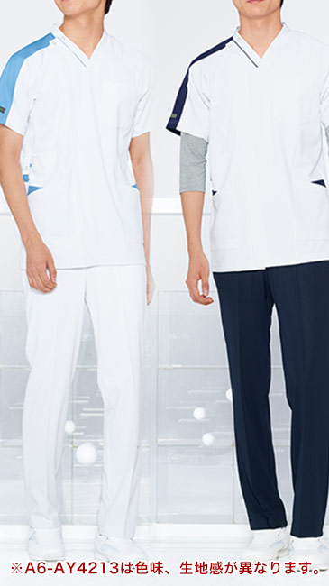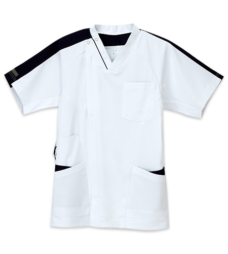 汗をかきやすい、暑がりの男性におすすめ!動きやすさと涼しさのプロファンクション機能を搭載したホワイトスクラブは、アシンメトリーなカラーラインが洗練されたイメージです。業務用洗濯にも耐えうる形態安定素材でキレイが長持ちします。
